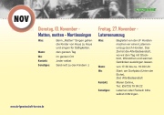 NAPORVwww.dorfgemeinschaft-horsten.deDienstag, 10. November -Matten, matten - MartinssingenFreitag, 27. November -LaternenumzugWas:Wann:Wo: Kontakt: Sonstiges:Beim „Matten“ Singen gehen die Kinder von Haus zu Haus und singen für Süßigkeiten.den ganzen Tagim ganzen OrtJeder selbstSeid nett zu den Kindern :)Was:Begleitet von der JF Horsten machen wir einen Laternen- umzug durch Horsten. Das Ziel ist die Alte Badeanstalt, wo wir den Tag mit Stock- brot, Würstchen und warmen Getränken ausklingen lassen.von 17: 30 bis ca. 19: 00 UhrStart: am Dorfplatz (Unter der Eiche),Ziel: Alte BadeanstaltMaren Dehne,Tel.: (05723) 79 99 22Laternen oder Fackeln bitte selbst mitbringen.Wann: Wo:Kontakt: Sonstiges: